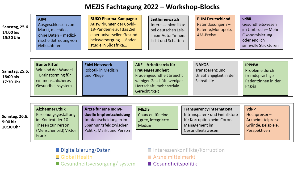 Am Samstag und Sonntag hatten wir zahlreiche weitere Ärztevereinigungen und Akteur:innen des Gesundheitswesens geladen. In 14 Workshops und einem „Markt der Möglichkeiten“ widmeten sie sich einem breiten Themenspektrum: Von der Arzneimittelpreisentwicklung, über die Versorgung von Migrant:innen und notwendige Paradigmenwechsel in der Medizin und im Gesundheitswesen, Einflussnahmen in der Selbsthilfe bis hin zu Einfallstoren für Korruption und Problemen der globalen Gesundheitsversorgung in der Corona-Pandemie.