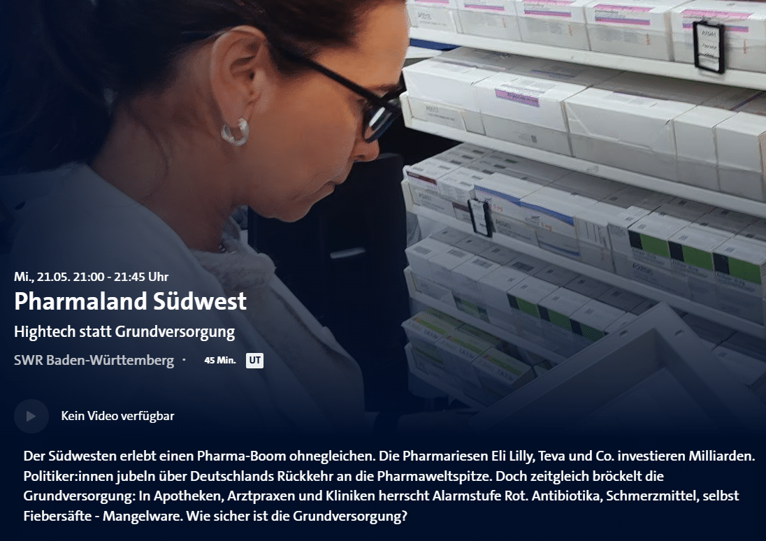„Lieferengpässe bei Arzneimitteln“ – zu diesem Thema strahlte der SWR Baden-Württemberg am 21.05.2025 die Reportage „SWR Story“ „Pharmaland Südwest – Hightech statt Grundversorgung“ aus. Unser Vorsta…