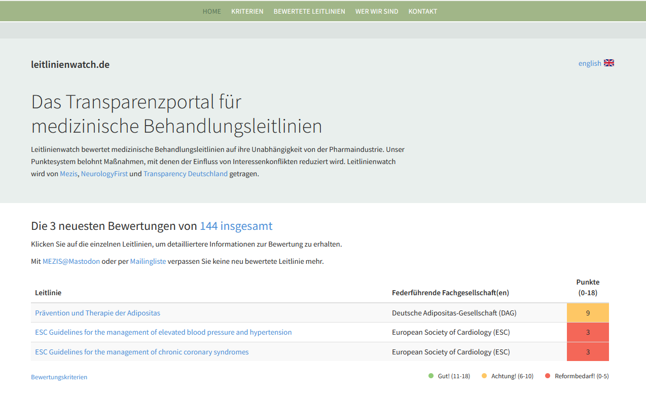 Leitlinienwatch.de hat inzwischen Bewertungsergebnisse von 67 deutschen S3-Leitlinien in der Fachzeitschrift BMC Medical Ethics publiziert: Management of financial conflicts of interests in clinical practice guidelines in Germany: results from the public database GuidelineWatch.